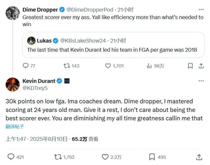 直播吧08月10日讯 休赛期的杜兰特继续与网友展开辩论。
